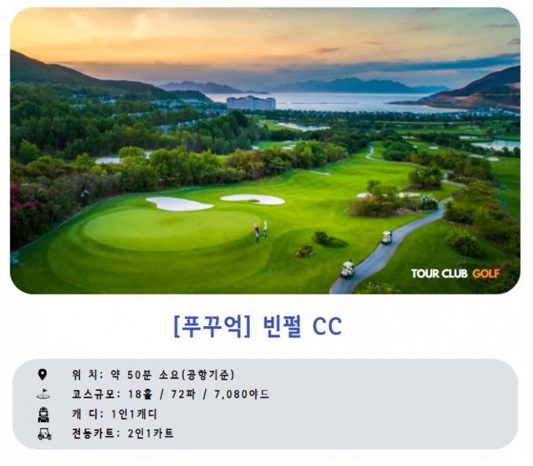 베트남 푸꿕섬에 위치하여 있으며 27홀 챔피언쉽 코스로, 개장 이전 부터 많은 관심을 받았으며 빈펄 그룹에서 운형하는 럭셔리한 리조트 골프 클럽입니다. 세계적으로 유명한 골프코스 설계회사인 IMG의 설계및 디자인으로 완공 되었습니다.