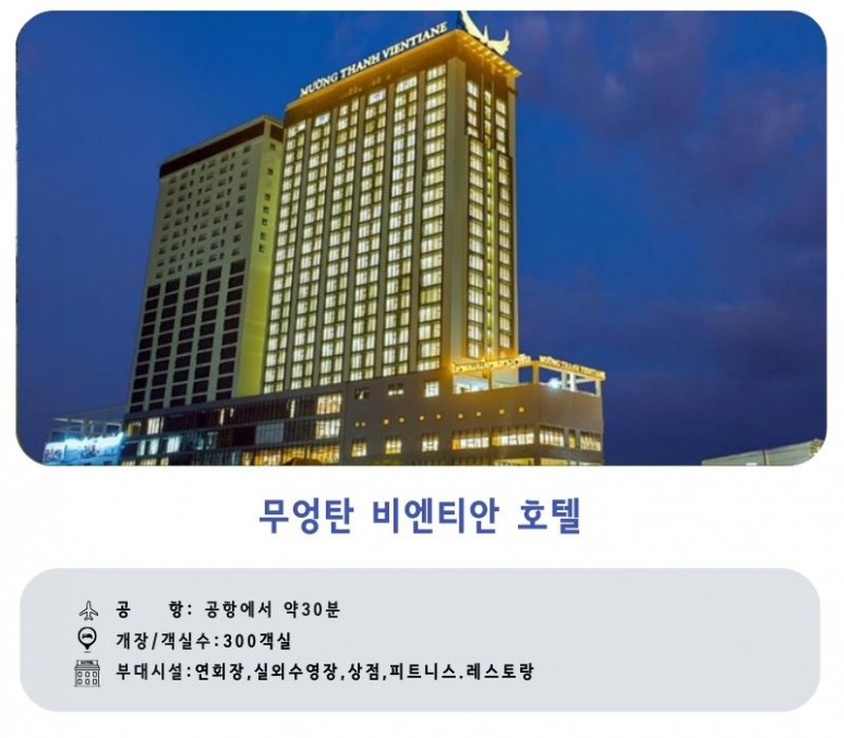 | 비엔티엔 | 전일 | 호텔 조식 후 가이드와 함께 골프장으로 이동 (약 30-40분소요) 롱비엔, 레이크뷰, 부영씨게임 C.C 중 18홀 라운딩 ★전신마사지 1시간★ 뭉친 근육과 피로를 풀어줄 마사지 (마사지사 매너팁 별도) ▶빠뚜사이 독립기념문 관광 석식 후 호텔 휴식 |