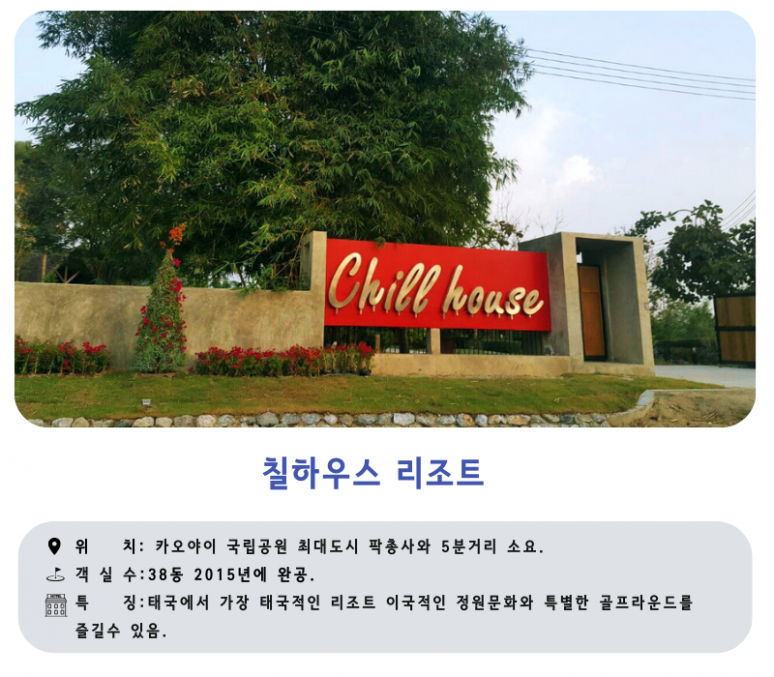 카오야이 국립고원과 팍총사와 5분거리.란초찬뷔 골프 코스와 1분 거리에 위치한 전원풍의 리조트 입니다.
