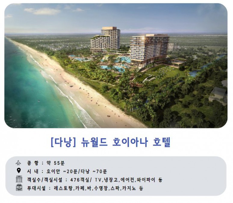 다낭의 떠오르는 대표 복합 리조트 단지이며 476룸 / 2레스토랑 / 3미팅룸 / 1그랜드볼룸홀이 있씁니다. 유네스코 세계문화유산인 호이안과 15분 거리 인접합니다.