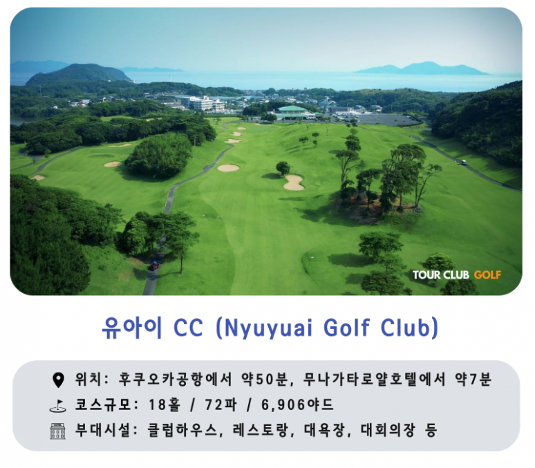 유아이CC는 후쿠오카현 무나가타시에 위치한 오션뷰의 골프장으로 2,000년 첫 개장을 하였습니다. 현해탄을 내려다보는 위치의 구릉지에 다이나믹하게 설계한 18홀 정규 코스로 초보자부터 상급자까지 모든 골퍼들이 만족할 만한 챔피언 코스입니다. 아웃코스는 '현해', 인코스는 '쓰야자키'라고 이름 붙여져 있으며 곳곳에 도사리고 있는 장애물들을 터프하게 공략해야 하는 골프 기술을 요구 합니다. 퍼팅 연습 그린과 40야드의 어프로치, 벙커샷 연습장도 갖추고 있습니다.