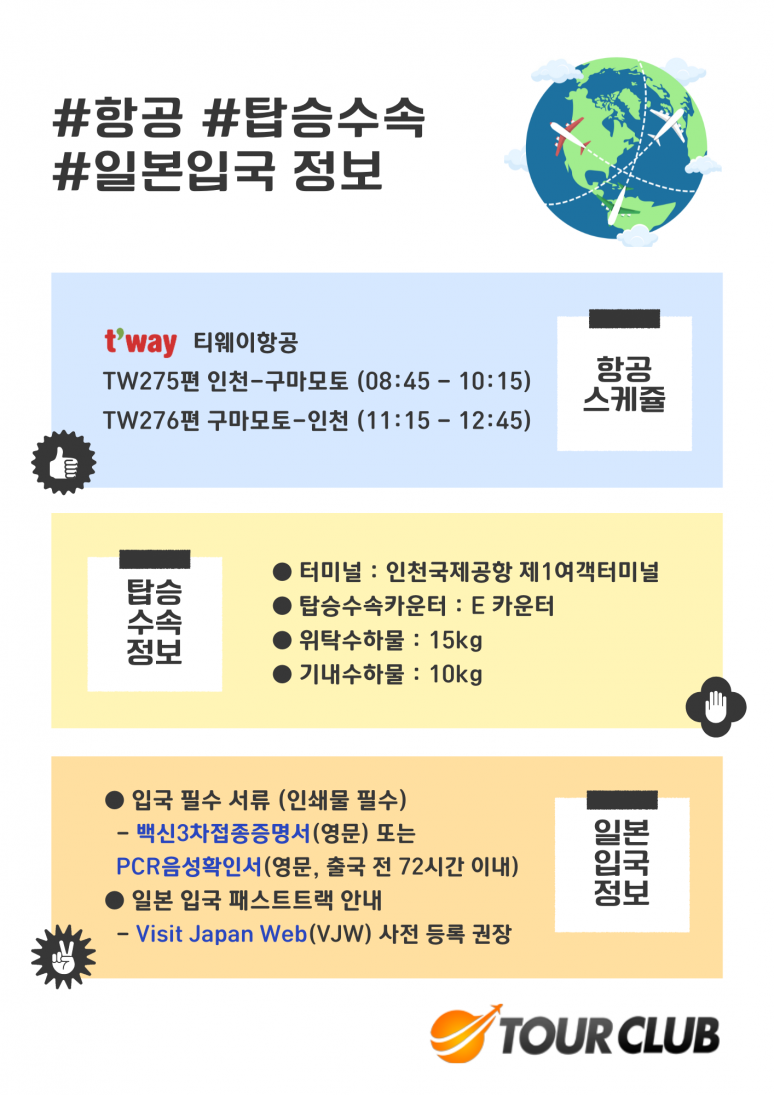 | 티웨이항공(TW) 매일 출발 | TW275편 인천공항 08:45 출발 ~ 구마모토공항 10:15 도착 |