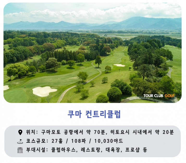 - 쿠마CC : 각자의 개성이 묻어나는「사츠마」「휴가」「히고」의 총 27홀 규모의 코스는 어떤 조합도 즐거운 플레이가 가능합니다. 사츠마와 휴가 18홀은 1973년에 개장하여 오랜 기간동안 회원에게 사랑 받아온 역사 깊은 골프장입니다.?