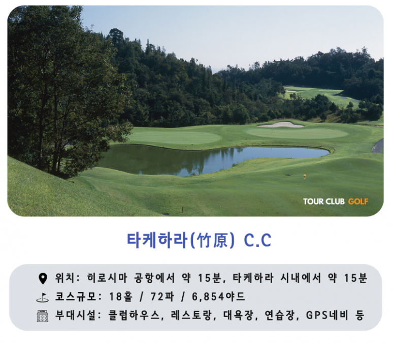 - 타케하라(竹原) CC : 1987년 LPGA 올해의 롤렉스 선수상과 1989년 LPGA 코닝클래식 우승을 거머쥔 세계적인 골프 선수 오카모토 아야코의 조언으로 코스를 조성 했습니다.?