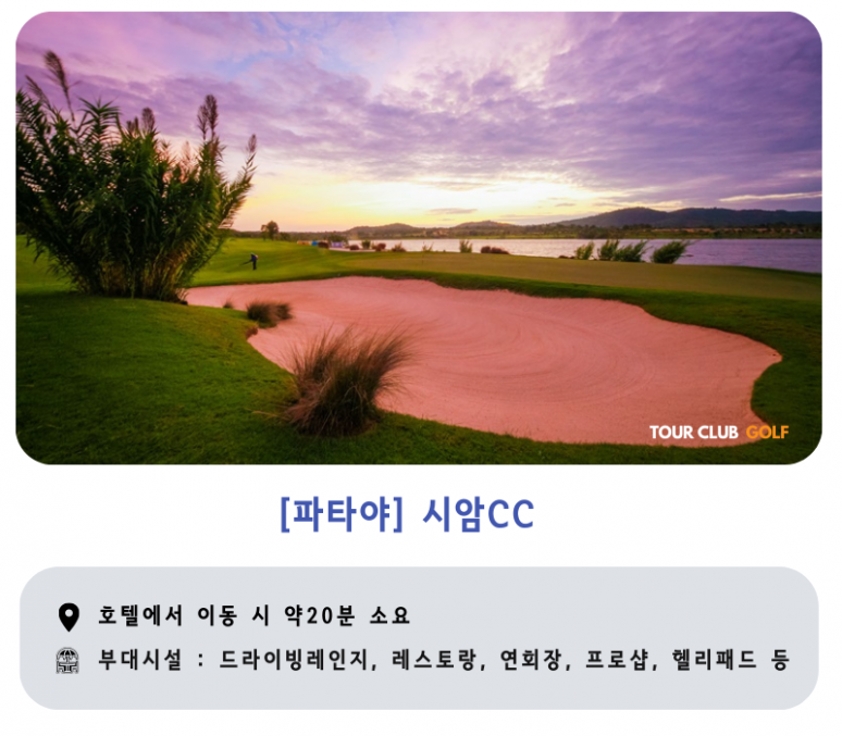 | 파타야 | 전일 | 조식 후 골프장으로 이동 (약 20~30분) ●시암CC,치짠CC,람차방CC 또는 동급 중 1곳 18홀 라운드 라운드 후 호텔로 이동 및 휴식 |