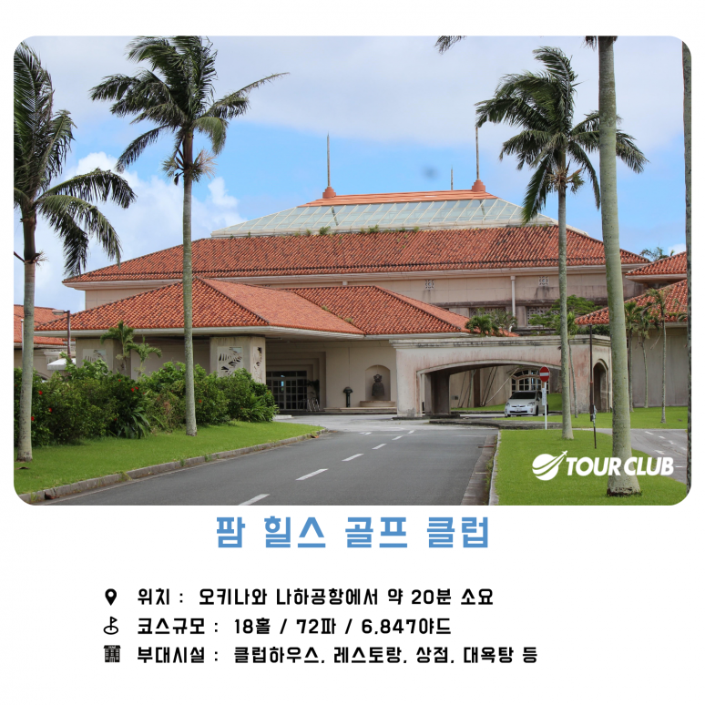 해발 130m의 완만한 구릉지에 편쳐진 골프코스로 골프장 코스 내에 팜힐즈라는 이름처럼 팜나무들이 배치되어 있어 이국적인 분위기의 골프장입니다. 전체적으로 플랫한 코스지만 내려치즞 홀이 많으며 페어웨이가 다른 골프장에 비해 넓은편으로 좀 더 편안한 플레이를 즐기실 수 있습니다. 18홀의 코스는 각 홀마다 개성 있는 이름이 있을 정도로 각 홀의 특성이 있습니다. 가드벙커가 있는 3번은 산도 아일랜드, 태평양을 향해있는 티샷의 3번 코랄게이트 등 여러 코스레서 아름다운 바다를 한 눈에 볼 수 있어 탁 트인 시야가 한 눈에 펼쳐지는 전망이 좋은 골프장입니다.