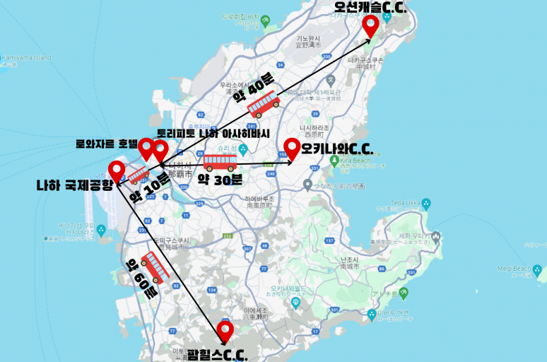 인천 국제 공항 출발 오키나와 나하 국제공항 도착 후 이동 (이동시간 약 60분) 팜힐즈 골프리조트클럽 (또는 동급) 기본 18H/ 스루플레이+셀프플레이 라운딩 후 호텔 체크인 및 휴식 |