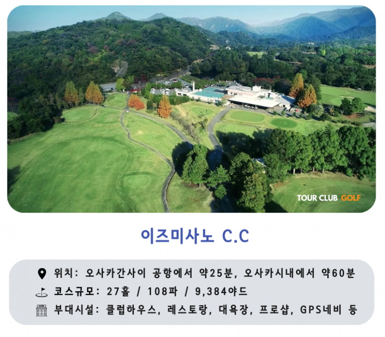 이즈미사노CC는 이즈미사노의 웅대한 자연을 그대로 살려 자연과 조화를 이룬 레이아웃과 함께 각자의 개성이 뚜렷한 3가지 코스로 이루어진 총 27홀 규모의 컨트리클럽입니다.