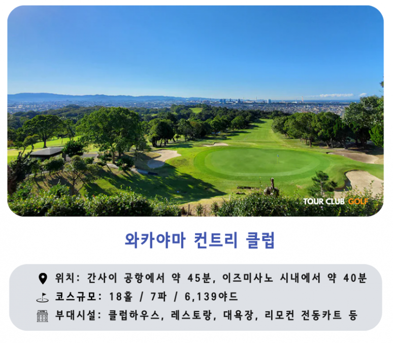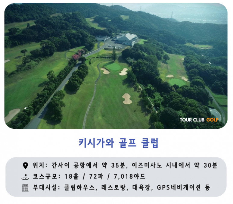 - 키시가와CC : 넓고 긴 페어웨이와 탁트인 시야로 와카야마현 최고의 호쾌한 코스로 불리우며, 비기너 부터 상급자 까지 모두 즐겁게 라운드 할 수 있습니다.