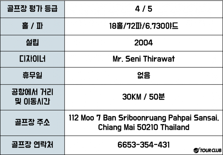 초급자와 중급자가 함께 즐길수 있는 태국 전통의 골프장이며 입니다. 치앙마이에 있는 상급수준의 골프장이며, 수목이 아름답고 코스 전체가 편안함을 느끼게 해주는 가장 치앙마이다운 이미지를 보여주고 있으며 기존에 있던 과수목들을 그대로 살려 수많은 망고, 포멜로, 리치 나무들로 둘러싸여 있는 페어웨이는 과일향을 함께 즐길 수 있는 즐거움과 여유가 같이 있는 코스로 구성되어 있습니다.
