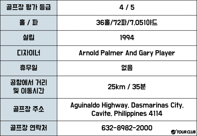 플레이어 코스와 팔머 코스 두 곳으로 나누어져 있습니다. 플레이어 코스는 러프가 길고 억새서 한번 들어가면 보통 2타~4타는 감수해야 하는 곳입니다. 가파른 벙커와 풀이 무성한 습지대, 평탄한 언덕 등이 특징인 링크스타일의 형태를 갖추고 있습니다. 팔머 코스는 호수와 작은 시내 등 전통적인 공원 형태를 띄고 있어 경관이 무척 아름답습니다.