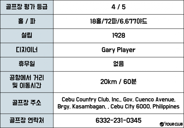 세부컨트리클럽은 필리핀세부에서 가장 오래된 골프장입니다. 1928년에 9개의 홀로 지어졌습니다. 1960년대에 9홀을 증설하여 18홀파 71의 골프장이 되었으며 이후에 파 72로 개조했고 1990년대에 Gary Player는 전체코스를 방문객들에게 더 매력적으로 보이도록 재설계했습니다.