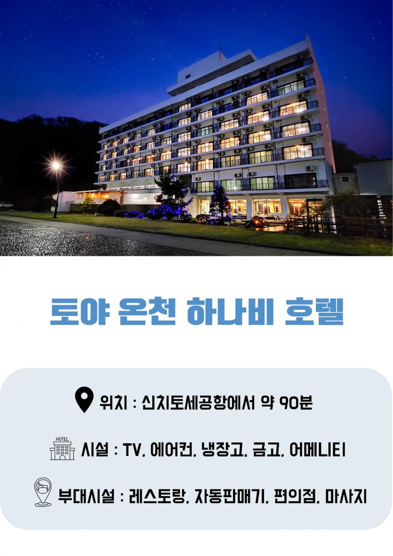 | 숙소정보 : 토야 하나비 온천 호텔 또는 동급 | ||