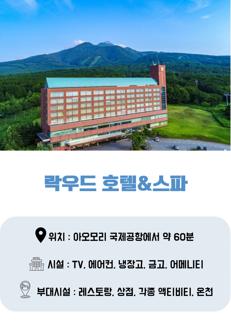 호텔 조식 후 체크아웃 공항 이동 (약 60분) 아오모리 국제공항 출발 인천 국제공항 도착 |