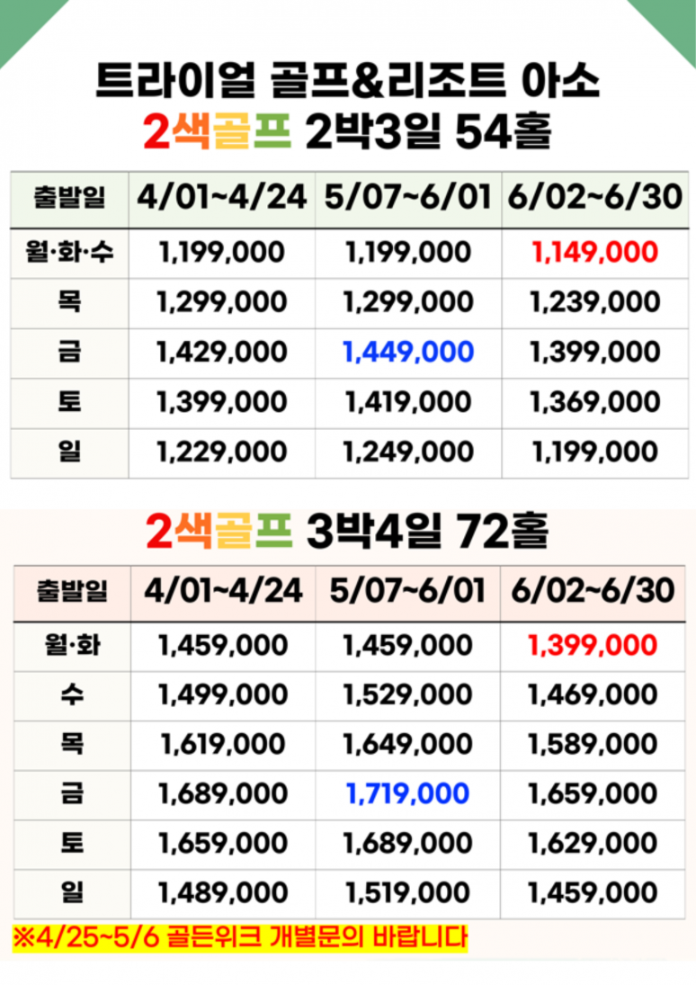 | 06/02-06/30 2박3일 기준 (요일별상이) 1,149,000원 | 출발일 별로 요금 상이 합니다.(항공요금 LCC 최저가 기준) ※출발 가능 여부 및 상세 요금 문의 요망※ |