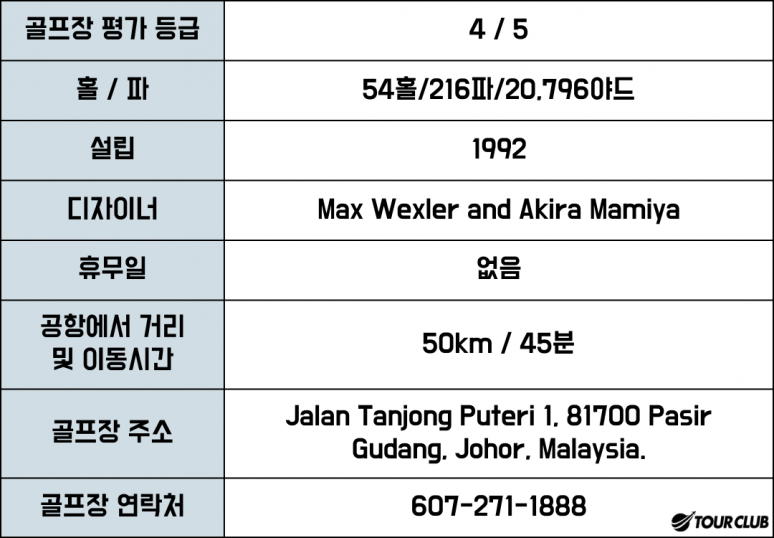 ?플랜테이션 코스는 1992년 11월 개장했습니다. 이 지역은 한때 기름야자 농장이었으며 과수원과 코코넛 숲을 개발한 노동자들을 수용하기 위한 마을이 있었습니다. 이러한 농장과 농장의 원래 경작된 부분이 코스 경관을 형성합니다. 페어웨이를 둘러싸고 있는 수많은 기름야자나무가 보존되어 있습니다. 홀 4, 6, 7, 14, 15, 17에 있는 과일 나무에는 두리안, 망고, 잭프루트, 람부탄이 포함됩니다. 플랜테이션 코스의 길이는 6,454m입니다.