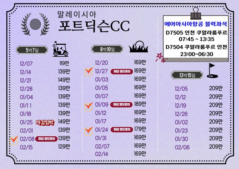 | 에어아시아 12월~2월 항공블락 | D7505 (07:45 13:35) | D7504 (23:00 - 06:30) |