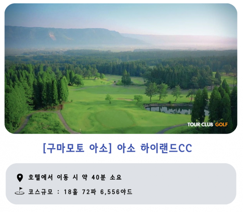 아소지역인 외륜산 둘레를 따라서 아름다운 풍광과 함께 아소 오악중 한곳인 키시마다케의 언저리에 위치한 전형적인 산약형 코스로 이루어져 있 는 골프 코스로서 고스기 리조트 내의 부대시설인 18홀의 리조트 골프 클럽입니다. 생각보다는 스코어가 잘 나오는 코스로 선호도가 높으며, 한 여름에 부킹하기가 쉽지 않은 코스로도 알려져 구마모토현 내 약 42곳의 골프 코스중 중상급 에 들어가는 골프코스로 한국의 골퍼들도 즐겨 찾는 골프장입니다.?