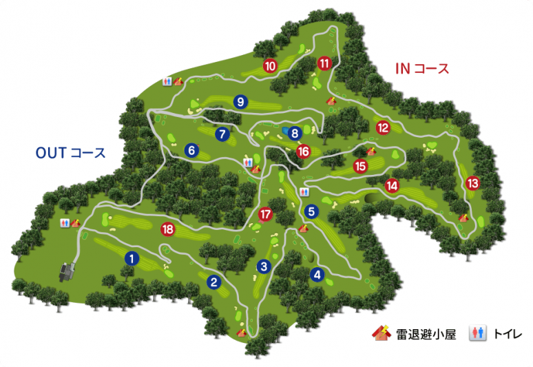 업다운이 적은 비교적 평탄한 구릉지 코스. 페어웨이도 넓고, 조형적으로도 정직한 것이 많아 차분한 인상을 준다. 그러나 전체적으로 미묘한 언듈레이션과 곳곳에 연못이 설치되어 있어 거리가 길다. 상당히 까다로운 코스로 되어 있기 때문에 평균적인 골퍼들에게는 어려운 홀이 많다. 우드나 롱아이언을 사용하는 경우가 많기 때문에 테크닉을 많이 활용해야 한다. 14개 클럽을 모두 사용하는 전략성이 높은 본격적인 챔피언 코스이기도 하다.?