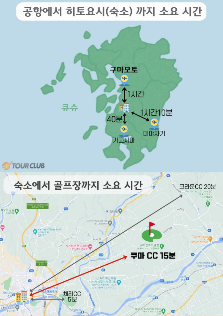 인천 -> 구마모토 공항 도착 차량 탑승후 골프장 이동 (약 1시간 소요) ★ 쿠마cc or 크라운cc 18홀 라운드 (※16:30분까지만 라운드를 하시고, 클럽하우스로 17:00 이전 복귀) (※18홀 라운드를 다 못하시더라도 환불은 없습니다.) 석식 후 호텔 투숙 및 휴식 |