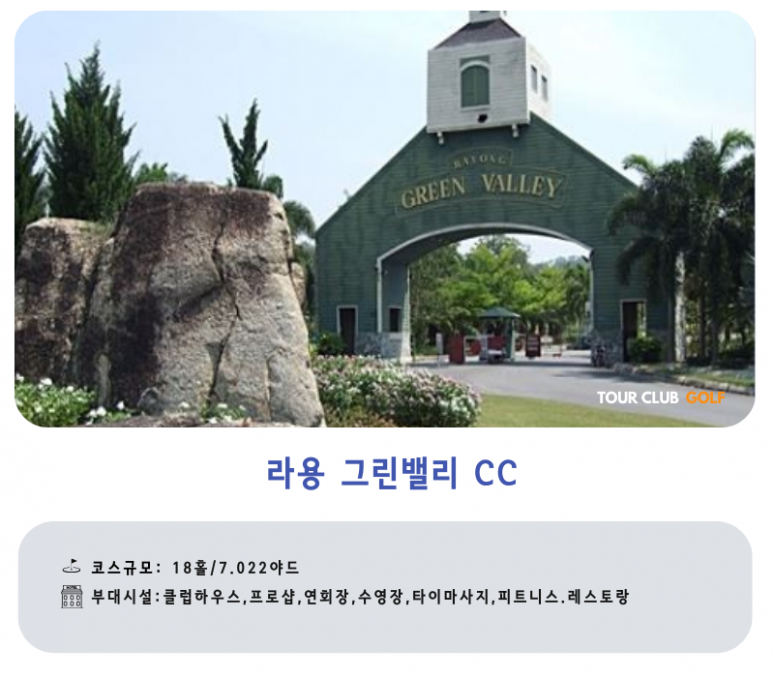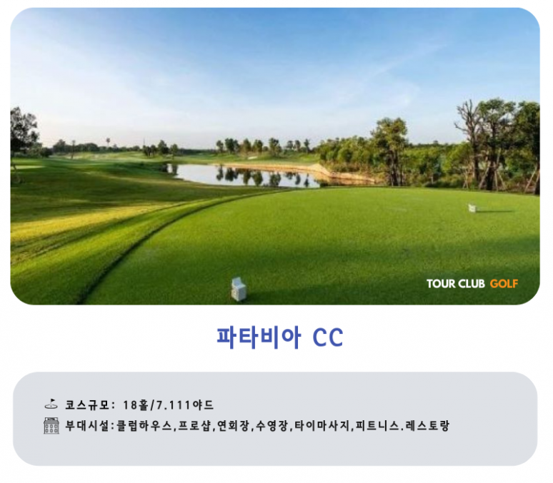 | 파타야 | 전일 | 호텔 조식 후, 골프장으로 이동 파타비아아 CC .그린우드CC.라용 그린밸리 CC 中 18홀 라운딩 자유일정 및 석식 후, 호텔 투숙 및 휴식 |